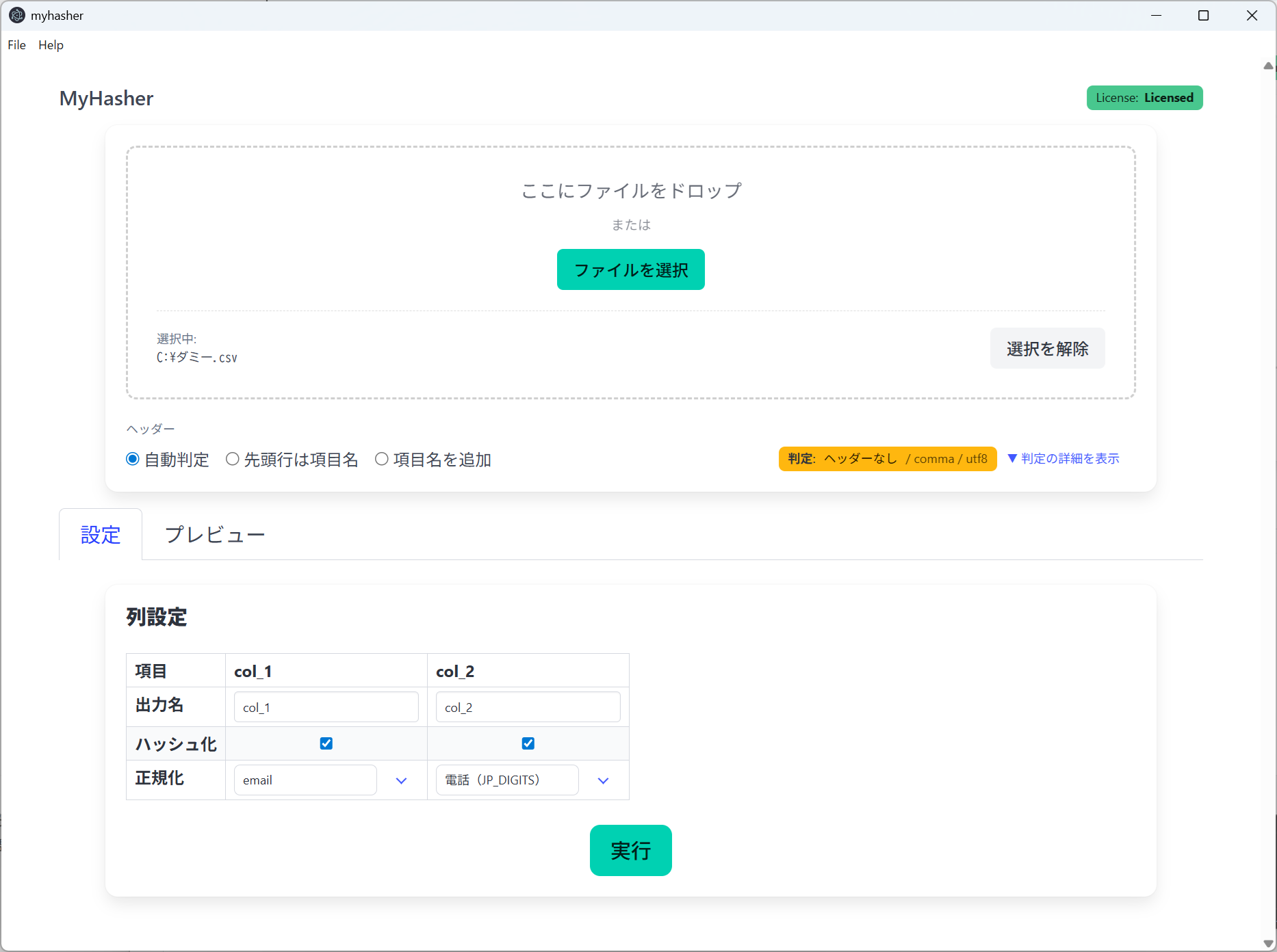 CSVを読み込み、実行ボタンを押すだけでハッシュ化できます。